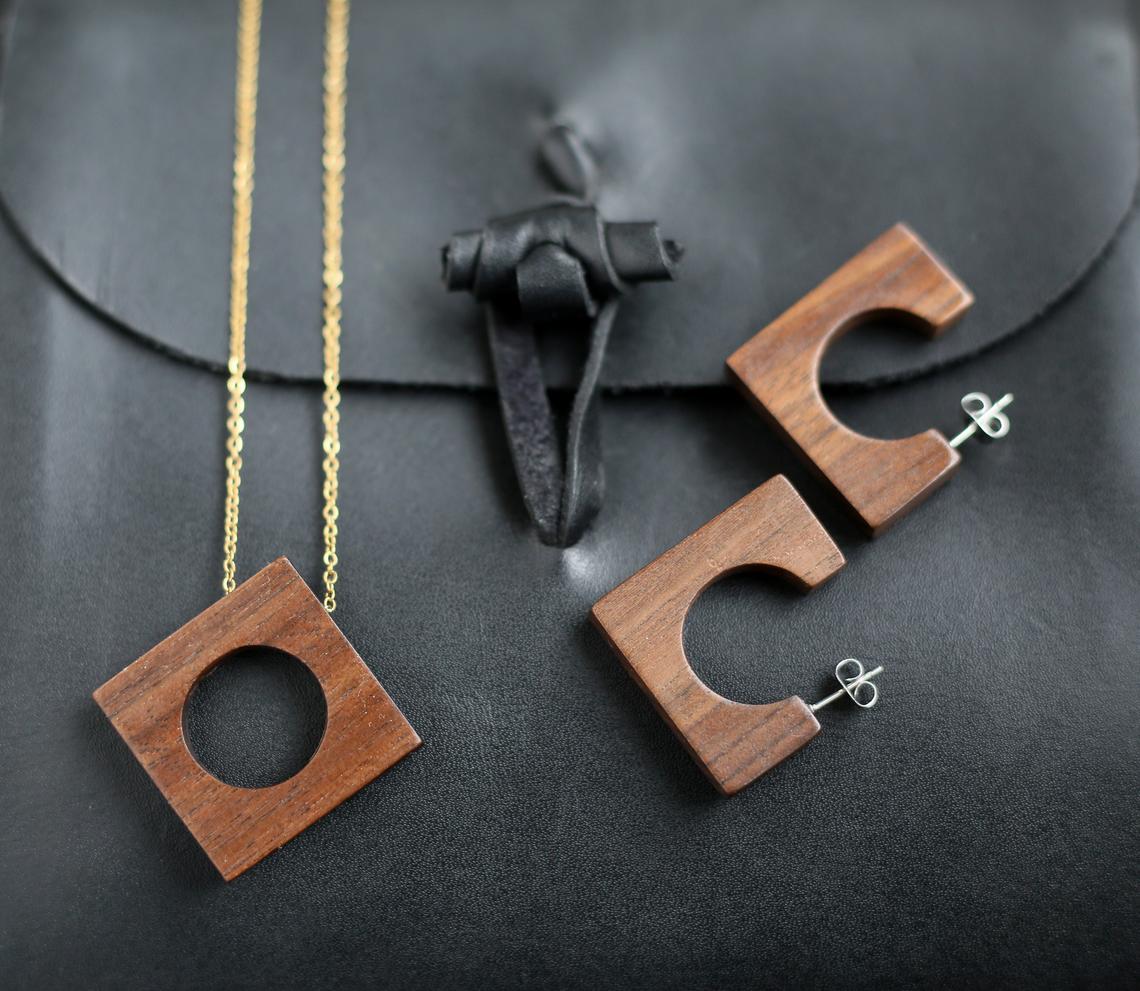Exotic wood jewelry set with earrings and necklace handmade in a very old walnut wood, recovered from the columns of an old farm by my partner Emanuel. The lightness, hardness and sound of the wood is exceptional.