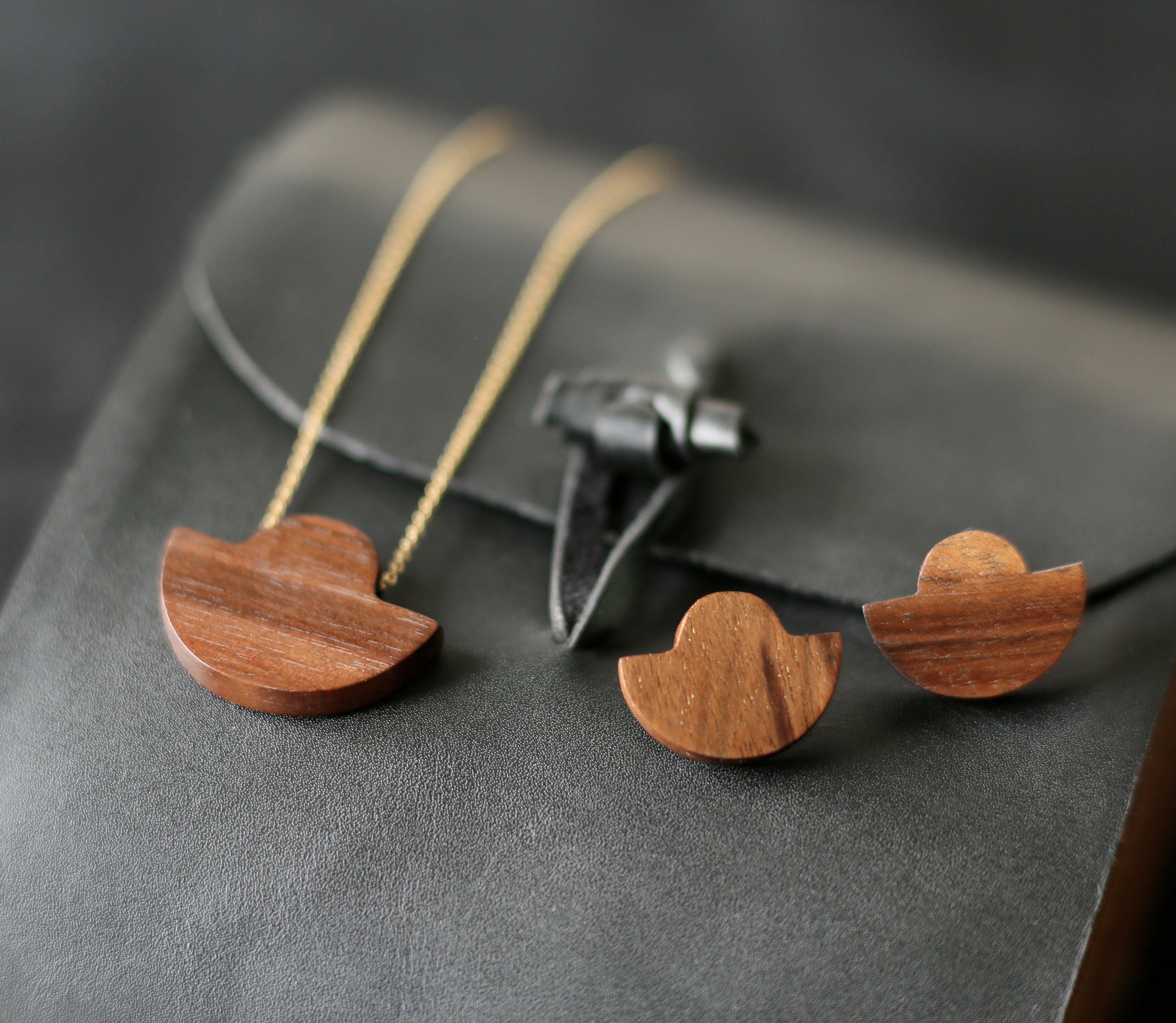 Hypoallergenic ethnic stud earrings and necklace made of ancient walnut wood, which comes from recovered wood from a old farm. The texture of the wood is mixed with the quality of the hypoallergenic pins in 316L surgical steel.