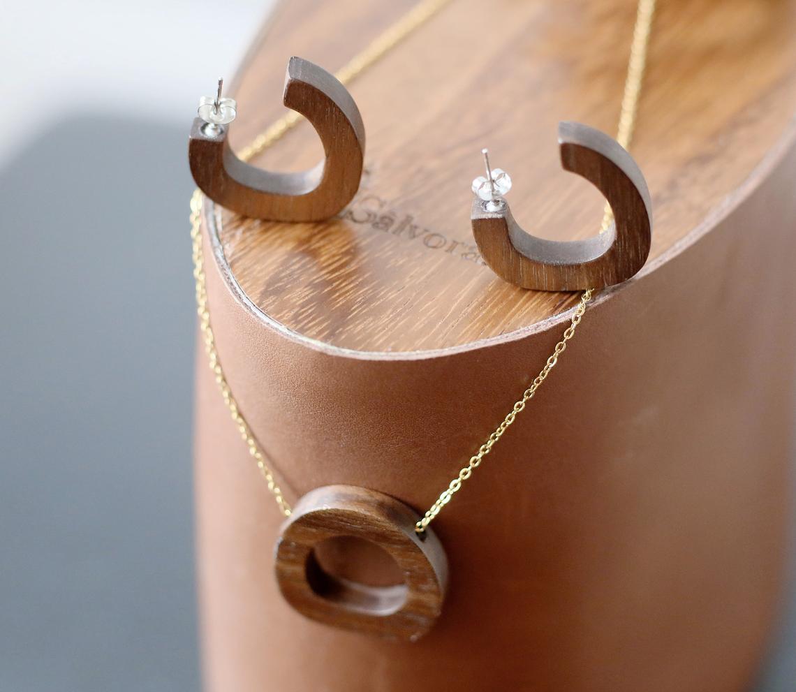 Mayan jewelry set with earrings and necklace handmade in a very old walnut wood, recovered from the columns of an old farm by my partner Emanuel. The lightness, hardness, sound and texture of the wood is mixed with the high quality of the hypoallergenic pins and chain in certified 316L surgical steel.